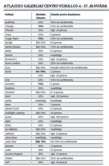 Janvārī, kad iepirkšanās drudzis ir atslābis, veikali pircējus mēģina vilināt ar atlaidēm. Reklāmas plakāti Rīgas ielās vēsta, ka šobrīd Galactico tirdzniecības centros Alfa, Origo, Galerija Centrs, Mols un Dole norisinās izpārdošana līdz 70%, arī Rīga Plaza ziemas izpārdošanai sola līdz 70% lielu atlaidi. Elkor Plaza piedāvā sezonas izpārdošanu ar 60%, Stockmann – izpārdošanu ar 30% atlaidi. Euronics ir uzsācis noliktavas tīrīšanu, preces pārdodot ar atlaidi līdz 50%.