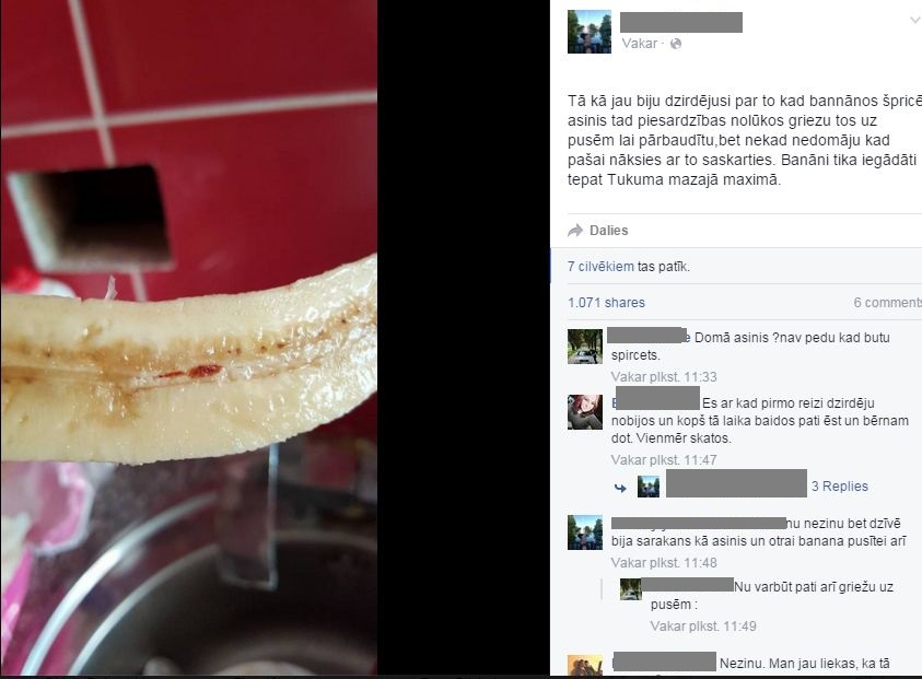 “Tā kā jau biju dzirdējusi par to kad banānos špricē asinis tad piesardzības nolūkos griezu tos uz pusēm, lai pārbaudītu, bet nekad nedomāju, ka pašai nāksies ar to saskarties. Banāni tika iegādāti tepat Tukuma mazajā Maximā,” raksta sociālo tīklu lietotāja, kura attēlu papildinājusi ar “asiņainā'” banāna bildi.