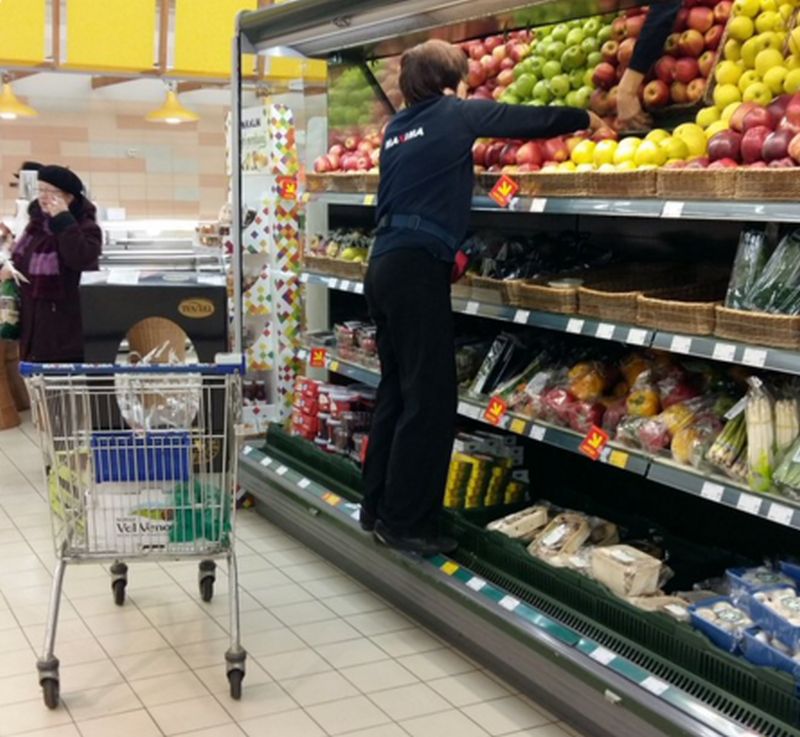 “Kāda pārdevēja ar ielas apaviem “dod vaļā” pa plauktiem,” vēstī konts “Bon apetit”, kurš ierakstu papildinājis arī ar pārdevējas, kura ar kurpēm iekāpusi augļu plauktā, attēlu.
