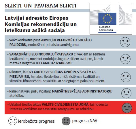 Latvijas valdībai ieteikts «rīkoties, lai uzlabotu veselības aprūpes sistēmas pieejamību, izmaksu lietderību un šis sistēmas kvalitāti» utt. Kā to izdarīt, nepalielinot budžeta deficītu? EK Latvijas pārstāvniecības padomniece Agnese Dagile Neatkarīgajai atbildēja, ka vajagot slimnīcām un ārstiem maksāt par labu darbu un nemaksāt par sliktu darbu. Viņu sliktais darbs ir faktiska nestrādāšana. Proti, slimnīcas reāli strādā tikai dažas stundas diennaktī, bet pārējā laikā vienīgi atgaiņājas no vissmagāk slimajiem, jo neatliekami sniegta palīdzība viņiem izmaksātu pārāk dārgi. Tie, kuri ar skandālu vai kukuļu palīdzību tomēr nonāk slimnīcās, vispirms pavada daudzas stundas bez jebkādas palīdzības uzņemšanas nodaļās, pēc tam tieši tāpat vairākas dienas – slimnīcu nodaļās, kur ārstēšanu drīkst uzsākt tikai nākamā vai aiznākamā maiņa ar savu medicīnisko manipulāciju apmaksas mini budžetiņu, kas atkal tiek izsmelts dažās darba stundās. Rīgā, piemēram, vajag apvienot, t.i., reāli slēgt, divas no trijām lielākajām – vai nu Stradiņa, vai Austrumu slimnīcu un jebkurā gadījumā Bērnu slimnīcu, visus pacientus ārstējot vienā vietā, taču šādai reformai būtu pārāk daudz politisku un tehnisku šķēršļu, tāpēc pagaidām uz to nepiespiedīs pat EK pamudinājumi.