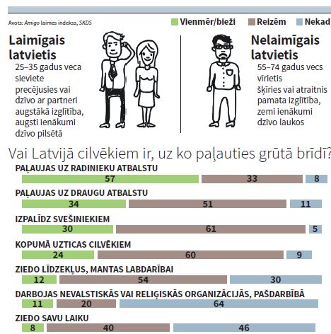 Ikgadējā Latvijas iedzīvotāju laimes indeksā secināts, ka gada laikā cilvēki kļuvuši laimīgāki un sevi par tādiem sauc 70 procenti aptaujāto. Tomēr jaunākā aptauja nāk ar ziņu, ka pusei Latvijas iedzīvotāju nav, uz ko paļauties grūtā situācijā. Ir arī zināmā mērā nepatīkams secinājums, ka liela daļa cilvēku nav gatavi ikdienā izpalīdzēt svešiniekam, ziedot līdzekļus vai laiku labdarībai un kopumā neuzticas citiem.
