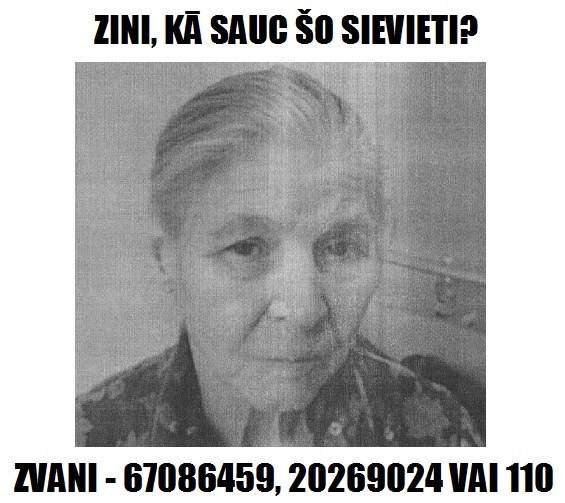 Valsts policijas Rīgas reģiona pārvaldes Kriminālpolicija saņēmusi informāciju par sievieti, kura nogādāta medicīnas iestādē, taču nav spējīga sniegt informāciju par sevi. Sieviete ir aptuveni 70 – 75 gadus veca, par sevi var pateikt, ka viņu, iespējams, sauc Ļuba.