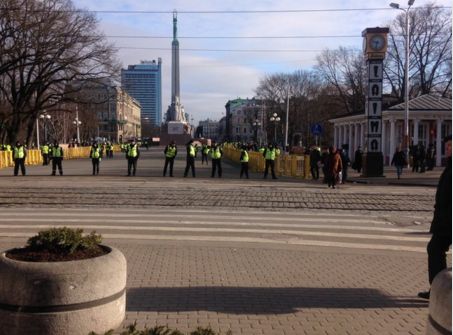 Policisti pie Brīvības pieminekļa pulcējušies, lai nodrošinātu sabiedrisko kārtību.Turklāt blakus policistiem, Bastejkalnā notiek "antifašistu" pikets. Aculiecinieki ziņo - Bastejkalnā tiekot pieminēti visi vācu ebreji, kas mira Latvijā no Wafen-SS rokas.