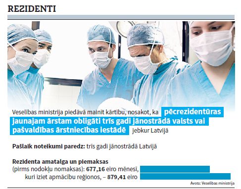 Veselības ministrijā Neatkarīgajai stāsta: priekšlikumu par mehānisma radīšanu, lai jaunie ārsti pēc rezidentūras programmas pabeigšanas būtu gatavi doties darbā uz ārstniecības iestādēm ārpus Rīgas, izteica Latvijas Slimnīcu biedrība, ņemot vērā satraucošo situāciju reģionu ārstniecības iestādēs. Statistikas dati liecina, ka pēc rezidentūras beigšanas vairākums ārstu lokalizējas Rīgas reģionā – 2015. gada 1. janvārī Rīgas reģionā pamatdarbā strādāja 71 procents no kopējā ārstu skaita, bet Latvijas reģionos – 29 procenti no kopējā ārstu skaita. Šādai praksei turpinoties, būtu apdraudēta ārstu pieejamība reģionālajās ārstniecības iestādēs, kur jau šobrīd liela daļa ārstu ir pensijas un pirmspensijas vecumā.
