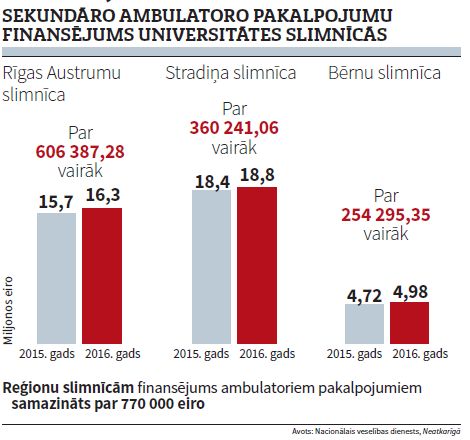 Savukārt NVD skaidro, ka reģionu slimnīcām šogad piedāvātajos līgumos ir plānots mazāks finansējums ambulatoro pakalpojumu nodrošināšanai nekā pērn un «samazinājums ir saistīts ar to, ka 2015. gadā šajās ārstniecības iestādēs nav sniegts viss plānotais pakalpojumu apjoms katrā no pakalpojumu veidiem». Proti, dienests skaidro, ka svarīgākais nosacījums, kāpēc slimnīcas saņem mazāk, nav vis tas, ka papildu nauda rindu mazināšanai bija vajadzīga Rīgas lielajām slimnīcām, bet šo reģionu «slimnīcu neefektīvas līdzekļu administrēšanas dēļ», un «nav pieļaujams, ka pacientiem tiek liegta iespēja saņemt gadam plānoto ambulatoro pakalpojumu apjomu». «Sniegto pakalpojumu apjoms iepriekšējā gadā ir būtisks rādītājs, kas ik gadu tiek ņemts vērā, plānojot līguma summu nākamajam gadam, līdz ar to iepriekšējā gadā neapgūtie līdzekļi tiek novirzīti pakalpojumiem atbilstoši Ministru kabineta noteikumos noteiktajām prioritātēm,» informē NVD. Šī prioritāte ir onkoloģijas pacienti, un, tā kā lielākā pacientu plūsma onkoloģijas pakalpojumu saņemšanai ir universitāšu slimnīcās, šogad lielāks finansējums piešķirts ambulatoro diagnostisko izmeklējumu nodrošināšanai onkoloģijas pacientiem Rīgas Austrumu slimnīcā un Stradiņa slimnīcā.