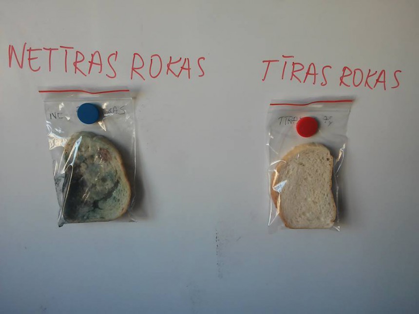 Skolotāja raksta: "Gribēju padalīties ar kādu mazu eksperimentu, ko nesen veicām 2.klasē. Novērojot to, ka daudzi bērni pirms ēšanas ļooooti slinki mazgā rokas bija jāizdomā veids, kā viņiem pašiem "izvēlēties" rokas mazgāt kārtīgi. Tā kā vīrusi un baktērijas uz rokām nav acīm saredzami, to klātbūtni vajadzēja pierādīt. Ņēmām talkā 2 baltmaizes šķēlītes, 2 plastikāta maisiņus un 20 pārus netīru roku. Viena šķēlīte 20 netīru roku "apmīļota", otra - izcili tīra. Rezultāts pēc 1,5 nedēļas bērnus tik ļoti pārsteidza, ka nu vismaz uz kādu brīdi, pie izlietnēm roku mazgāšanas rinda tik ātri nenoplok un nav jāatgādina, ka paskalot zem ūdens, neskaitās kārtīgi nomazgāt rokas. Varbūt, ka šis eksperiments noder arī kādam mājās, mēģinot izveidot ieradumu, mazgāt rociņas regulāri un kārtīgi!"