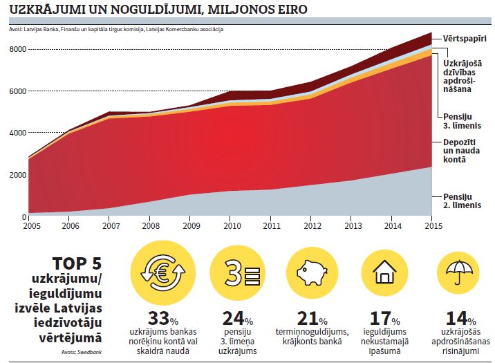 Pēc Finanšu un kapitāla tirgus komisijas un Centrālās statistikas pārvaldes datiem, Latvijas iedzīvotāji banku norēķinu kontos un depozītos 2010. gada nogalē glabāja 4,01 miljardu eiro jeb 1932 eiro uz vienu iedzīvotāju, savukārt 2015. gada nogalē šī summa bija pieaugusi līdz 5,4 miljardiem eiro jeb 2708 eiro uz vienu iedzīvotāju – sasniedzot vēsturiski augstāko līmeni. Vienlaikus Eiropas Centrālās bankas (ECB) monetārie stimuli ietekmējuši arī procentu likmes, nospiežot tās vēsturiski zemākajā līmenī. 2011. gada jūlijā ECB noteikta procentu likme bija 0,75%, bet šā gada martā – mīnus 0,4%.