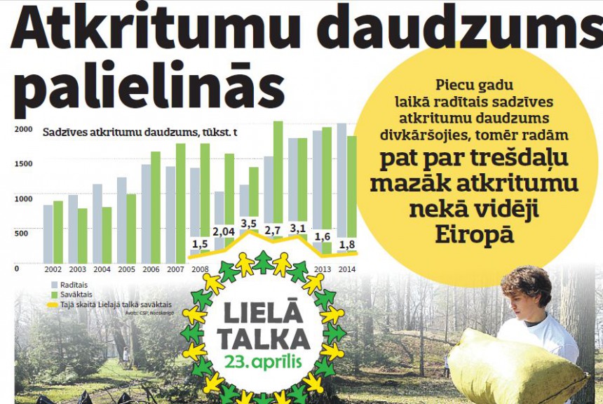 Par tīrāku Latviju iestājas arī Lielās talkas organizētāji. Šogad Lielā talka notiks jau devīto reizi. Ik gadu tiek savāktas vairākas tonnas atkritumu. Rekordliels atkritumu daudzums – 3,5 tonnas – tika savākts 2010. gadā. Pērn 175 000 talkotāju no mežiem un citām vietām izvāca 1943 tonnas atkritumu, kas tika nogādāti atkritumu poligonos. Šogad, vismaz Rīgā, savāktie talkas atkritumi nevis tiks vesti uzreiz uz Getliņiem, bet tos nogādās šķirošanā.