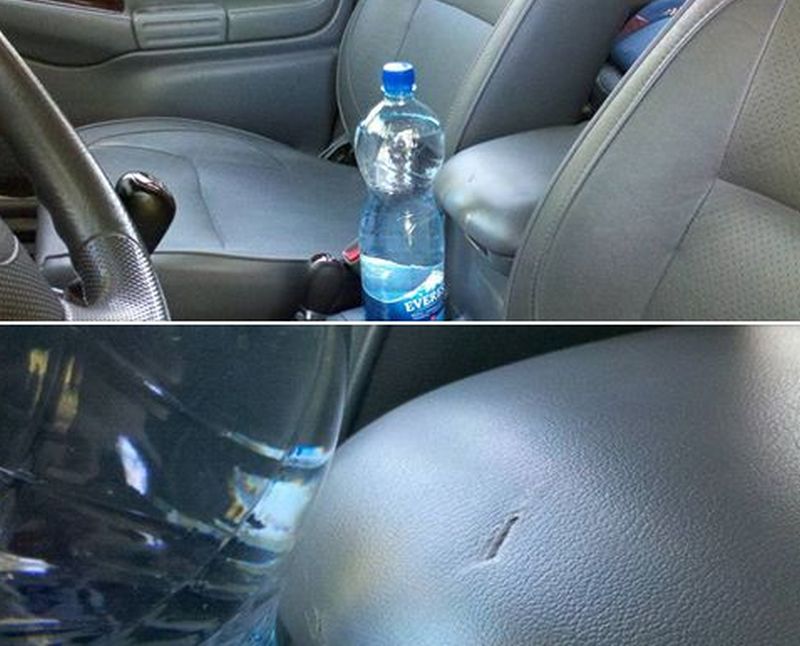 Kā izrādās, tad automašīnā atstātā ūdens pudele saskarē ar saules gaismu izveidojusi palielināmā stikla efektu un automašīnā esošajam roku balstam "izdedzinājusi" caurumu.