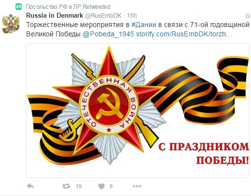 Oficiālais Krievijas vēstniecības Latvijā twitter konts dalījies ar Krievijas vēstniecības Dānijā ieraktu, kurā tiek ziņots par aizvadītajiem 71. uzvaras gada dienas pasākumiem Dānijā. Tāpat ieraksts padarīts “daiļāks” ar attēlu, kurā redzama gan Georga lentīte, gan padomju savienības simbolika - sirpis un āmurs.
