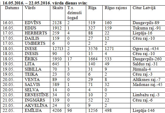Pilsonības un migrācijas lietu pārvaldes (PMLP) Iedzīvotāju reģistra statistikas dati liecina, ka no kalendārā iekļautajiem personvārdiem nākamnedēļ vispopulārākais vārds ir Inese (12713), savukārt no vīriešu vārdiem – Ēriks (5950).