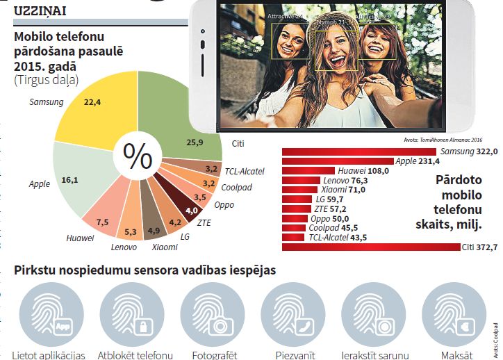 Arī Ķīnas mobilo telefonu ražotājs Coolpad viedtālrunī Torino S piedāvā pirkstu nospiedumu lasītāju, kas var atpazīt 10 pirkstus. TCCM Baltijas valstu reģionālā vadītāja Rudīte Straupe lepojas, ka pirkstu nospiedumu lasītājs šajā telefonā ir ļoti ātrs (sensora reaģēšanas laiks ir tikai pussekunde) un tas var skenēt pirkstu nospiedumus visos virzienos. «Tieši tāpēc mēs to saucam par 360° pirkstu nospiedumu sensoru. Tās ir precīzs 99,99% gadījumu,» uzsver arī Coolpad produktu menedžeris Marko Bojadziskis.