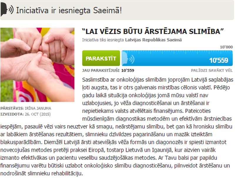 Onkoloģisko pacientu organizāciju alianses iniciatīva "Lai vēzis būtu ārstējama slimība", par kuru portālā http://manabalss.lv parakstījušies vairāk nekā 10 500 Latvijas iedzīvotāju, pagājušajā piektdienā ar portālahttp://manbalss.lv atbalstu ir iesniegta Saeimā, un deputātiem būs jālemj par papildus 10 miljonu eiro piešķiršanu ik gadu onkoloģijas jomai. Tuvākajā laikā iesniegums tiks nosūtīts parakstu pārbaudei Pilsonības un migrācijas lietu pārvaldē un pēc tās sāksies iniciatīvas izskatīšana Latvijas valsts augstākajā likumdošanas institūcijā.