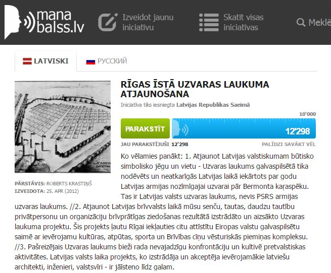 Iniciatīvu portālā manabalss.lv priekšlikums "Rīgas īstā Uzvaras laukuma atjaunošana" savākusi vairāk nekā 12 tūkstošus parakstus un tā nodota Saeimā.