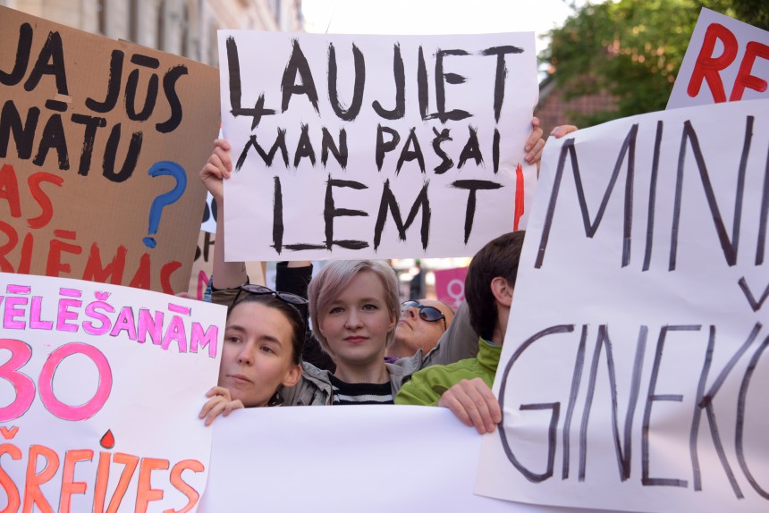 Vairākiem akcijas dalībniekiem rokās ir baloni un plakāti, uz kuriem rakstīts "Sievietēm ir arī galva", "Līdz vēlēšanām 30 mēnešreizes", "Sieviete nav tikai dzemde", "Rokas nost no sievietes olšūnām" un citi.