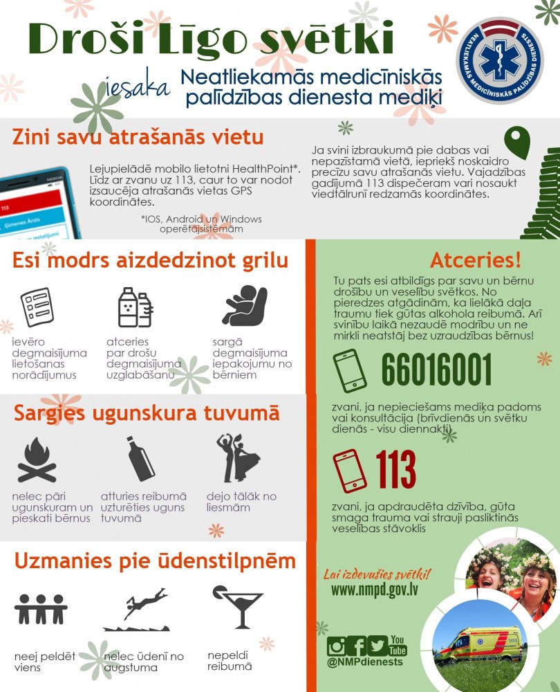 Diemžēl katru gadu Līgo svētku laikā Neatliekamās medicīniskās palīdzības (NMP) dienesta mediķi sniedz palīdzību smagi cietušajiem, tostarp pieaugušajiem un bērniem. Negadījumi notikuši gan peldoties, gan lecot ūdenī, kā arī neievērojot drošību aktivitātēs pie ugunskuriem, griliem. Lai nepieļautu negadījumus, NMP dienesta mediķi aicina Līgo svētku brīvdienās nebūt pārgalvīgiem.