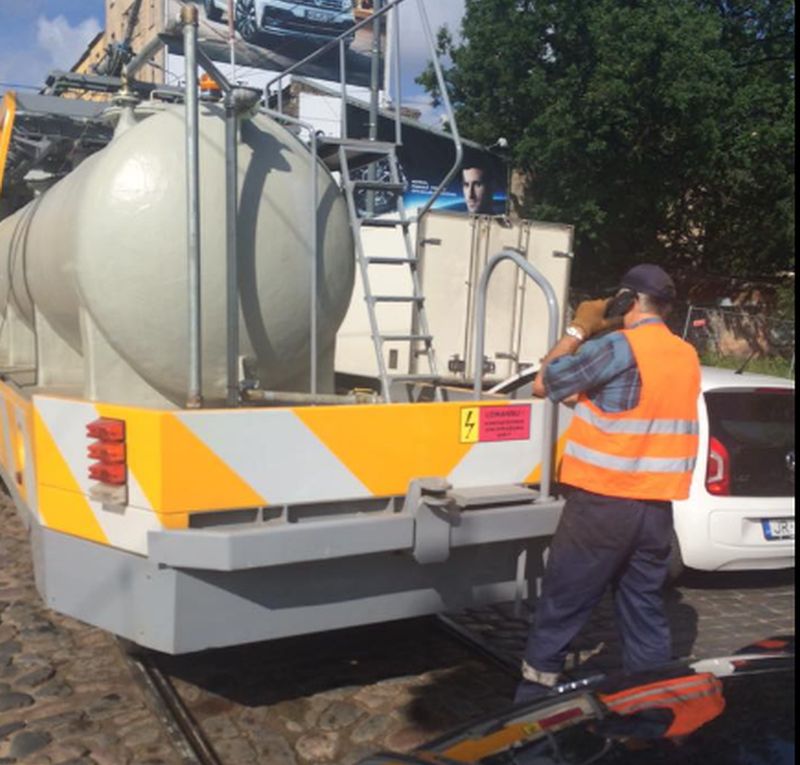“Tramvaju sliežu tīrītājs atpakaļ gaitā ietriecās mana automašīnā! Lūgums citiem automašīnas vadītājiem vai garāmgājējiem, kas redzēja šo negadījumu sazināties ar mani pa tālruni 26310579!! Lūgums atsaukties, jo tramvaja sliežu tīrītāja vadītājs un regulētājs sniedza nepatiesu liecību!”