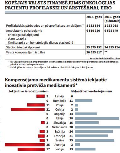 Nacionālā veselības dienesta dati rāda, ka 2015. gadā valsts kompensējamām zālēm vēža pacientiem izlietoti 20,7 miljoni eiro, bet šim gadam NVD finansējumu nenosauc, paskaidrojot, ka «summa netiek plānota, jo maksājums tiek veikts atbilstoši faktiskajam izlietojumam». Par iespējamām izmaiņām kompensējamo medikamentu sistēmā, jaunu medikamentu iekļaušanu vai zāļu apmaksu pēc citiem nosacījumiem NVD komentāros ir atturīgs, uzsverot, ka tas ir veselības politikas jautājums un par to jālemj Veselības ministrijai.