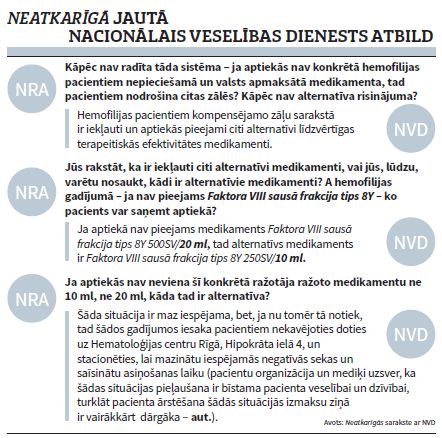 Atkārtotu vēstuli ar lūgumu risināt situāciju Nacionālajam veselības dienestam (NVD) nosūtīja arī Rīgas Austrumu slimnīcas Ķīmijterapijas un hematoloģijas klīnikas vadītāja profesore Sandra Lejniece. Jau jūlija sākumā mediķi bažījās par pacientu dzīvību un veselību un Veselības ministrijai un NVD nosūtīja vēstuli, ka aptiekās nav pieejams medikaments hemofilijas A ārstēšanai - vienīgais valsts kompensētais medikaments, ko pacienti var saņemt un kas hemofilijas pacientiem ir būtiski, lai novērstu asiņošanu. Iestādes pēc pāris dienu izmeklēšanas ziņoja, ka zāles ir pieejamas, tikai citā tilpumā, par ko Hemofilijas pacientu biedrība Neatkarīgajai paskaidroja, ka tā pacientiem nav alternatīva, jo ir būtiski apturēt asiņošanu, bet ar konkrēto vairumtirdzniecības bāzēs pieejamo zāļu formu pacientam principā visa diena jāpavada pie sistēmas (zāles tiek ievadītas vēnā). Vēl atklājās, ka nav arī zāļu hemofilijas B pacientiem, bet par to NVD skaidroja, ka tādā gadījumā jāprasa nākamais lētākais medikaments. «Šāda situācija neliecina par sakārtotu sistēmu, un, tā kā zāļu pārrāvumi atkārtojas, mēs ļoti lūdzam atrisināt situāciju, panākot, ka Latvijas pacientiem tiek nodrošināti medikamenti bez pārrāvumiem un atbilstoši Eiropas ārstēšanas vadlīnijām,» Neatkarīgajai sacīja Hemofilijas biedrības vadītāja Baiba Ziemele. Savukārt Neatkarīgajai NVD uz jautājumu, ko dienests plānojis darīt, lai nepieļautu tādu situāciju nākotnē, kāda izveidojusies hemofilijas pacientiem ar zāļu nepieejamību aptiekās, ieteica vērsties Zāļu valsts aģentūrā, bet aģentūrā teica, ka ar kompensējamiem medikamentiem nodarbojoties NVD…