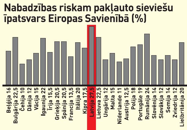 Atšķirības darba samaksā nozīmē to, ka sievietēm būs mazāki mūža ieņēmumi un pensijas, un tas ir pamatā apstāklim, ka sievietes ir pakļautas lielākam nabadzības riskam nekā vīrieši. To apliecina arī jaunākie Eurostat dati, kas īpaši skarbi kārtējo reizi izceļ Latviju – nabadzības riskam pakļauti turpat 30 procenti sieviešu. Tas ierindo mūsu valsti pirmajās rindās.