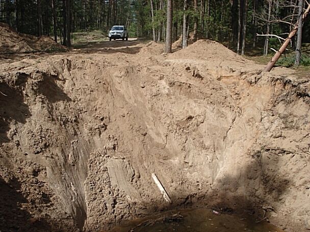 Jau ziņots, ka 2008. gada beigās mežā pie Skrundas – Lēnu autoceļa tika atrasta liela bedre, visticamāk, izrakta ar ekskavatoru. "Latvijas Valsts meži" bedri aizbēruši par saviem līdzekļiem. Bet pērn maija vidū bedre tajā pašā vietā radusies no jauna – pārdesmit metru plata un astoņus metrus dziļa. Vainīgos atrast nav izdevies.