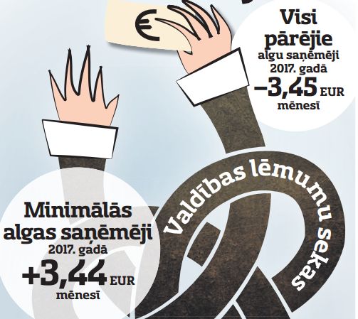 Minimālās algas saņēmēji par valdības dāsnumu, nolemjot paaugstināt to par 10 eiro, var pārlieku nesapriecāties, jo realitātē tie, kuriem nav neviena apgādājamā, uz rokas saņems vien par 3,44 eiro vairāk nekā šogad. Daļu naudas apēdīs nodokļi, bet daļu – neapliekamā minimuma samazināšana.