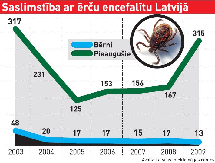 Pēdējos gados saslimstība ar ērču encefalītu bērniem ir samazinājusies, tomēr bērni turpina inficēties – pērn saslima 13 bērnu, bet 2008. gadā – 17. Tas ir uz pusi mazāk nekā 2003. gadā, kad saslima 48 bērni. Saslimstības samazinājumu bērniem speciālisti saista ar mērķtiecīgi veikto bērnu vakcināciju teritorijās ar augstu saslimstību. Arī pieaugušo saslimstība no 2003. gada ir mazinājusies, taču kā bīstams izņēmums jāmin pagājušais gads, kad inficējās 315 cilvēku – uz pusi vairāk nekā iepriekšējos piecos gados. Epidemiologi to izskaidro ar ērču aktivitāti, kas pagājušajā gadā situsi augstu vilni.