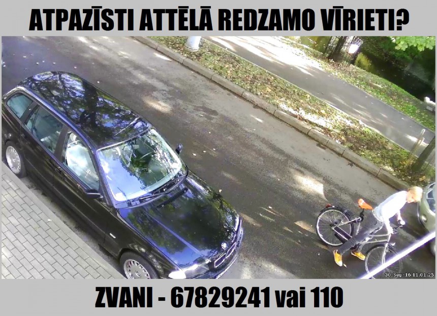 Pagājušonedēļ pagaidām nenoskaidrots velosipēdists Krišjāņa Valdemāra ielā sabojāja ceļa barjeru un svešu automobili. Valsts policija aicina aplūkot fotogrāfiju ar minēto personu un atsaukties ikvienu, kurš viņu atpazīst.