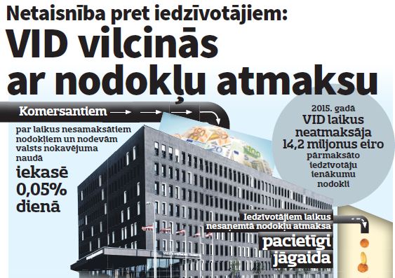 Pērn VID nespēja laikā atmaksāt 14,2 miljonus eiro par pārmaksāto IIN, un līdz ar to nodokļu maksātājiem iespējamā nesamaksātā nokavējuma nauda ir 14,3 tūkstoši eiro, aprēķinājusi VK, pamatojoties uz likuma Par nodokļiem un nodevām 28. panta otro daļu. Šis likuma pants nosaka: ja pārmaksātās nodokļu summas nepamatoti netiek atmaksātas likumā noteiktajā termiņā, atmaksājamo summu palielina par trim piektdaļām no šā likuma 29. panta otrajā daļā noteiktās nokavējuma naudas (tas ir, 0,05% no laikā nenomaksātā pamatparāda), ja konkrētā nodokļa likumā nav noteikti citi nokavējuma naudas apmēri, aprēķinot to no pārmaksāto nodokļu maksājumu summas par katru nokavējuma dienu.