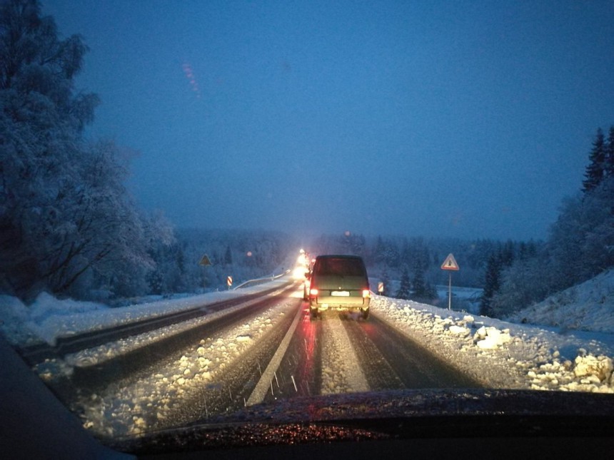Sociālajā medijā twitter.com kāds autovadītājs vēsta par sastrēgumu, kas sniega dēļ veidojas pie Cēsīm.