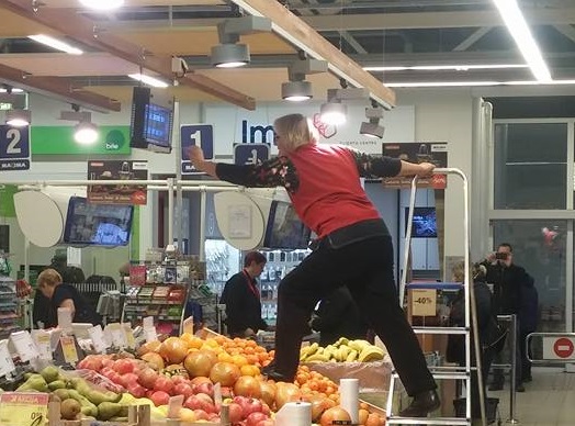 Sociālajā medijā facebook.com kāds Aizkraukles veikala "Maxima" apmeklētājs iemūžinājis situāciju, kurā veikala darbiniece ar kājām kāpj uz greipfrūtiem, lai notīrītu plauktu.