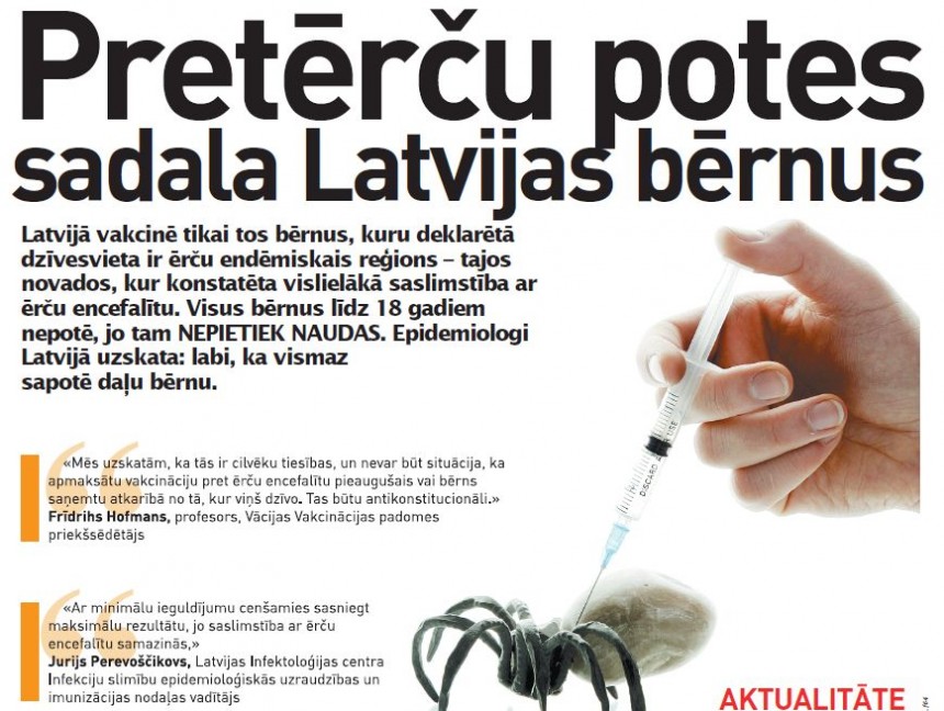 Lai arī pozitīvi vērtējams fakts, ka vismaz kādu daļu bērnu arī Latvijā vakcinē pret ērču encefalītu par valsts atvēlēto naudu, tomēr, velkot paralēles ar profesora F. Hofmana teikto, daļu bērnu Latvijā, piemēram, tos, kuri nedzīvo novados, kur inficēto ērču ir vairāk, bet gan pavada tur vasaras brīvdienas, var uzskatīt par diskriminētiem. Cena par pilnu vakcinācijas kursu, ja par to jāmaksā pašam, ir visai iespaidīga – no 60 līdz 75 latiem vienam bērnam. Reti, kurš vecāks pašreizējos apstākļos to var atļauties.