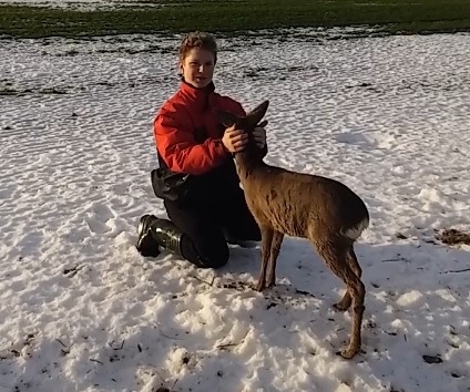 Video redzems, kā stirnēns tiek nests prom no nelaimes vietas un pēcāk nebēg prom, bet atļauj sevi glaudīt un filmēt.