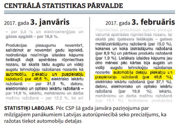 CSP darīja, ko varēja, lai panāktu ticamību rūpniecības pieaugumam. CSP 3. februāra paziņojumā par rūpniecības pieaugumu 2016. decembrī un gadā kopumā pieaugums «automobiļu, piekabju un puspiekabju ražošanā» modificēts par pieaugumu «automobiļu detaļu, piekabju un puspiekabju ražošanā (par 49,8%)». Tā, lūk, automobiļi saruka līdz «detaļām», ko Latvijā tiešām ražo labi aprīkotu darbnīcu līmenī, taču nav noliedzams, ka to ir vairāk nekā tikai dažas un to darbības rezultātus apkopot spēj tikai statistiķi.
