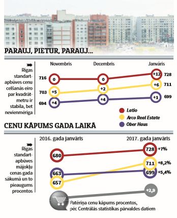 Centrālās statistikas pārvaldes aprēķinātais 12 mēnešu inflācijas rādītājs 2,9% šā gada janvārī atpaliek no Rīgas standartapbūves cenu pieauguma tajā pašā laika intervālā. Ober Haus šo pieaugumu novērtē ar +5,4%, Latio - ar +7,0% un Arco Real Estate - ar +8,2%.
