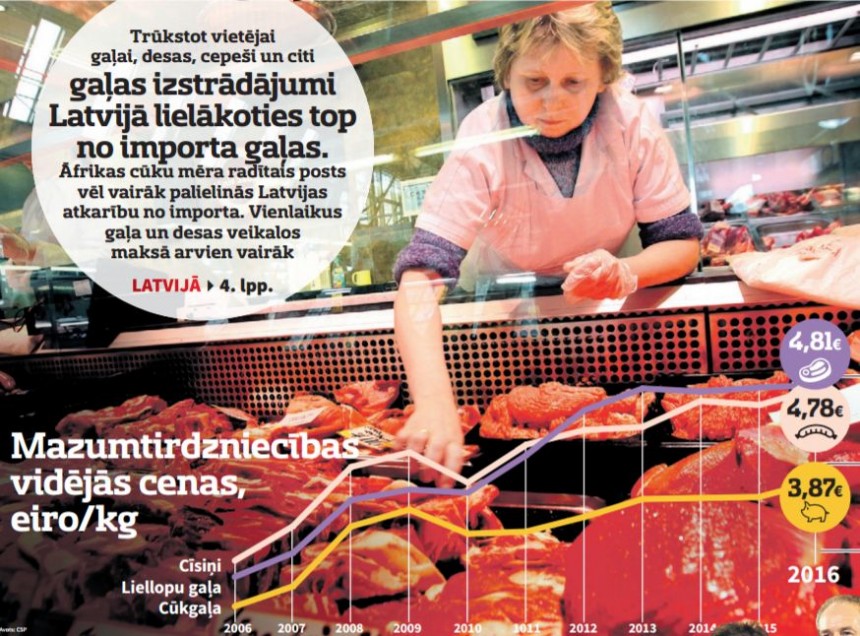 Trūkstot vietējai gaļai, desas, cepeši un citi gaļas izstrādājumi Latvijā lielākoties top no importa gaļas. Āfrikas cūku mēra radītais posts vēl vairāk palielinās Latvijas atkarību no importa. Vienlaikus gaļa un desas veikalos maksā arvien vairāk.