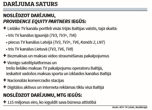 Zviedrijas mediju koncerns Modern Times Group (MTG) savu Baltijas biznesu pārdod Bite Latvija īpašniekam un Baltcom TV līdzīpašniekam – privātā kapitāla investīciju kompānijai Providence Equity Partners. Trīs dienas pirms šīs ziņas publiskošanas Latvijas mobilais telefons (LMT) noslēdza līgumu ar MTG par visu piecu kompānijas TV kanālu raidīšanu LMT mājas viedtelevīzijā.