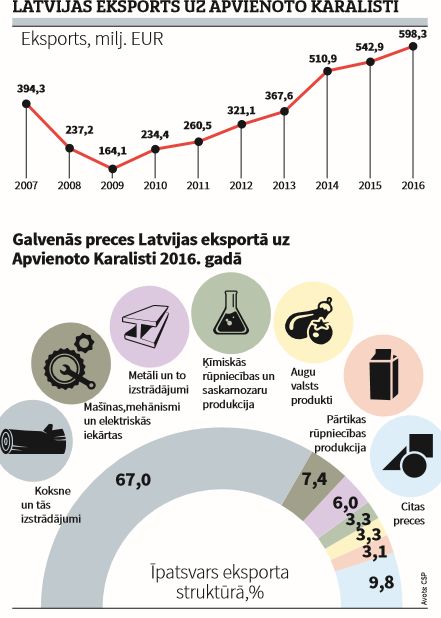 Viens no Latvijas ekonomikai būtiskākajiem jautājumiem saistībā ar notiekošo Eiropas lielākajā salā un tās paspārnē esošajos ģeogrāfiskajos punktos ir saistīts ar Latvijas eksportu. Ar nepilnu 600 miljonu eiro vērto preču pārdošanas apjomu Lielbritānija pērn bija sestā lielākā Latvijas eksporta partnere, turklāt tam ir tendence palielināties, pēc eksporta vērtības pērn apsteidzot Poliju. Neraugoties uz bažām par referenduma ietekmi, Lielbritānijas devums Latvijas ārējās tirdzniecības ieņēmumos pagājušā gada otrajā pusē ir tikai pieaudzis.