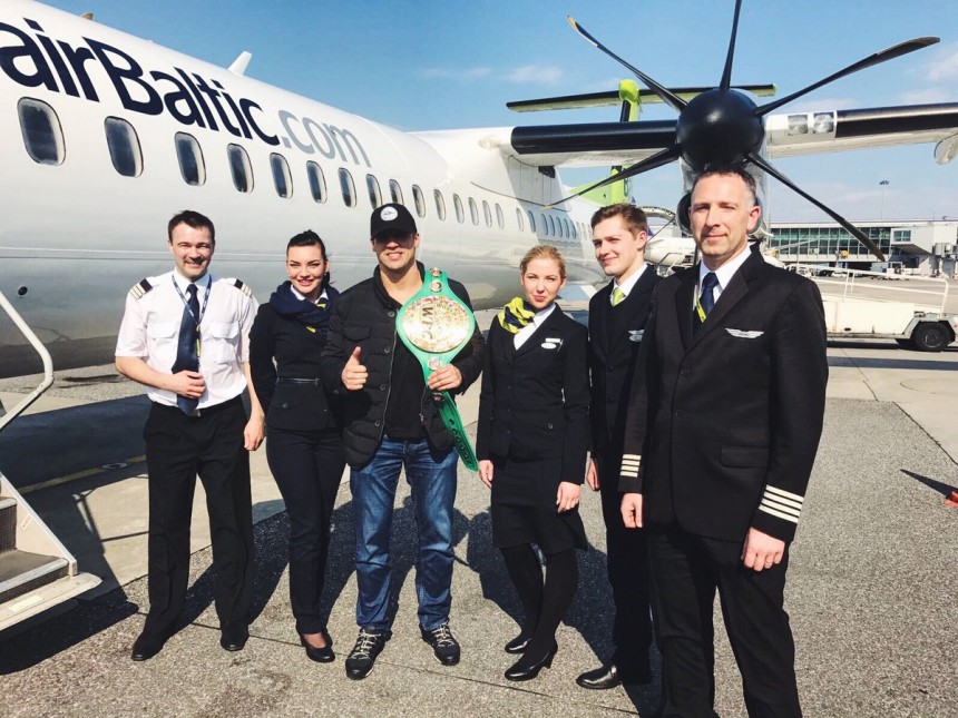 Proud airBaltic crew flies the proud winner, welcome home Mairis Briedis