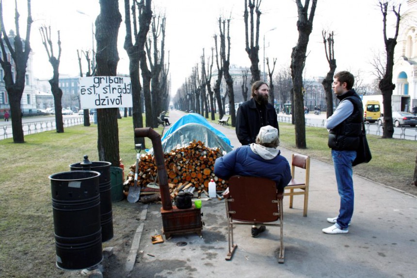 "Ir, ir vilšanās sajūta," saka teoloģijas students Jānis, kurš komūnā nodzīvojis četrus mēnešus. "Visu laiku gribēju iet prom. Atliku, atliku, beigās nolēmu, ka telti savākšu tad, kad būs plus desmit grādi, jo cerēju, ka tad gan te būs cilvēku ka biezs. Ziemā taču daudziem par apkuri parādi saradās, joprojām met cilvēkus no dzīvokļiem ārā, bet redzi, ka šurp neviens nenāk," nopūšas Jānis. Aktīvistu grupiņa no Ventspils gan solījusi kaut kad pievienoties, taču maza cerība, ka viņi ieradīsies. Arī māte daba pielikusi roku komūnas postīšanā – lielais vējš pa gaisu aiznesis telti un noplēsis arī plakātus. "It kā pateica – davai, tinieties!" nosmej Jānis. Tikmēr Juris domīgi ievelk cigaretes dūmu un sēž klusēdams. Uzmana tējkannu. Malku protestētājiem joprojām gādā zemnieks Jānis no Limbažiem. Tas pats, kurš gada sākumā arī pāris dienas pavadīja iepretim Ministru kabinetam, taču telts vietā izvēlējās nakšņot savā džipā.