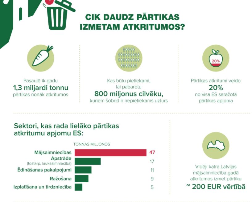 Laikā, kad daļa pasaules iedzīvotāju cieš no bada, ik gadu milzīgs nevajadzīgās pārtikas daudzums nonāk atkritumos. Latvijas Zaļā punkta infografikā apkopoti būtiskākie dati par pārtikas atkritumiem pasaulē, Eiropas Savienībā un Latvijā. Piemēram, vidēji viena Latvijas mājsaimniecība gada laikā izmet pārtiku 200 eiro vērtībā, raksta Zalais.lv