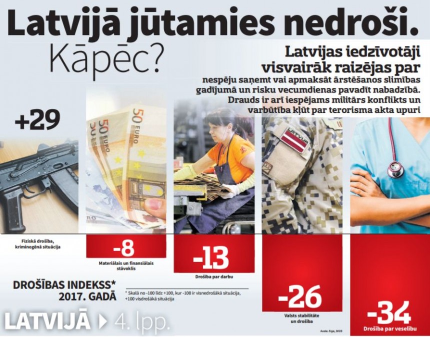 Latvijas iedzīvotāji jūtas nedrošāki par savu dzīvi nekā kaimiņvalsts iedzīvotāji, liecina apdrošinātājsabiedrības Ergo veiktais Baltijas valstu Drošības indeksa pētījums. Galvenās bažas joprojām cilvēkiem ir par kvalitatīvu veselības aprūpes pieejamību un nabadzību vecumdienās.