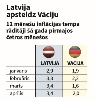 Šā gada gaita apstiprina Neatkarīgās 12. janvāra paredzējumu «no 2,2 droši uz 22». Ar 2,2 šeit apzīmēti oficiāli atzītās inflācijas procenti pērnā gada decembrī. Pie tā paša tika atzīts arī inflācijas lēciens. Šā gada pirmajos četros mēnešos 12 mēnešu inflācijas rādītāji kārtojas virknē +2,9, +3,3, +3,4 un tagad atkal +3,4% aprīlī, bet šajā gadījumā 3,4 = 3,4 + 0,4. Proti, aprīļa +3,4% pēc absolūtās vērtības ir lielāki par +3,4% martā, jo šā gada inflācijas bāzē jau iekļauti tie +0,4%, par kādiem patēriņa cenas kāpa pērnā gada aprīlī. Līdz ar to tikai vizuāli šķiet, ka inflācijas pieauguma līkne pārgājusi taisnē.