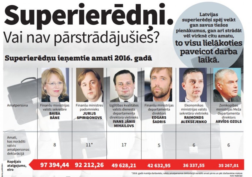 Latvijas superierēdņi spēj veikt gan savus tiešos pienākumus, gan arī strādāt vēl virknē citu amatu, to visu lielākoties paveicot darba laikā.
