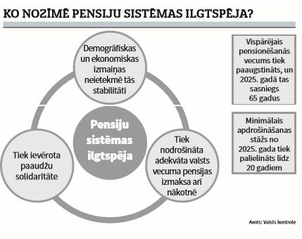 Valsts kontrole (VK) secinājusi, ka, ieviešot pensiju sistēmu, ir radīti priekšnoteikumi, lai sistēma būtu ilgtspējīga, lai tā saglabātu stabilitāti neatkarīgi no ekonomiskajām un demogrāfiskajām izmaiņām un nodrošinātu pensijas gan pašreizējiem, gan arī nākotnes pensionāriem. Tomēr valstī nav izdevies pilnā mērā realizēt pensiju pirmā līmeņa mērķi un nodrošināt, ka minimālās pensijas apmērs sasniedz 20 procentus no vidējās bruto algas valstī, mazinot pensionāru nabadzības risku. VK aprēķinājusi, ka 2015. gadā jau 17 procentiem pensionāru valsts vecuma pensijas apmērs bija mazāks par plānoto minimālās pensijas apmēru. Turklāt dati rāda, ka nabadzīgāko pensionāru īpatsvars pēc 2010. gada (tātad pēc krīzes) strauji pieaudzis - no pāris procentiem līdz teju divdesmit procentiem. «Attiecībā uz minimālo pensiju Latvija arvien vairāk atkāpjas no mērķa,» saka VK padomes locekle Inga Vārava. Ja valdība vēlētos palielināt minimālo pensiju, šogad tam būtu nepieciešami 70 miljoni eiro. «Iemesls, kāpēc nav iespējams pārskatīt pensijas, ir lielais personu skaits, kas neveic sociālās iemaksas vai veic tās no minimālās algas,» turpina I. Vārava. «2015. gadā 14 procenti strādājošo nebija pakļauti vispārējai sociālo iemaksu sistēmai.» VK iesaka veidot uzkrājumu sociālajā budžetā jeb tā saukto drošības spilvenu, ņemot vērā nākotnē prognozējamo pensionāru skaita pieaugumu.
