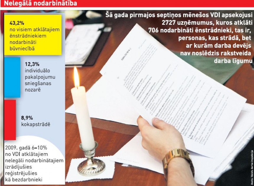 Lai gan nelegāļu ziedu laiks bija celtniecības bums, joprojām būvniecībā strādājošo bez darba līgumiem jeb ēnstrādnieku ir visvairāk. Celtniecības objektos ir daudz vairāk strādnieku nekā mazā veikaliņā vai zemnieku saimniecībā, un, tā kā celtniecība norit vairākās kārtās, darbinieki nepārtraukti mainās. Tas arī ir viens no iemesliem, kāpēc statistikas datos kā uzņēmumi, kuros visbiežāk tiek pieķerti ēnstrādnieki, ir būvniecības firmas. Taču tas ir mīts, ka bez līgumiem strādā tikai celtnieki. VDI dati liecina, ka nelegālā nodarbinātība izplatīta praktiski visās nozarēs. Jaunākais VDI pārskats rāda, ka tiešām visvairāk nelegālo atklāts celtniecības uzņēmumos – Centrs un būve, Eirobūvmetāls, AGS būve, kā arī citos – piemēram, Siguldas dārzi nodarbinājuši 24 cilvēkus bez darba līgumiem.