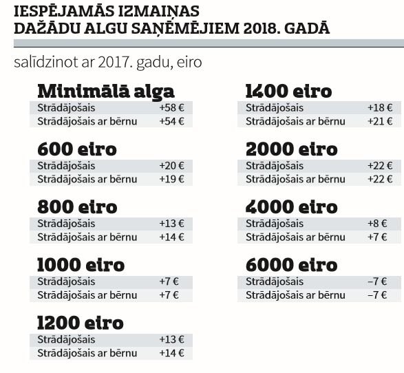 Savukārt tiem, kuru pamatalgas nemainīsies, plānotais ieguvums būs mazāks - no dažiem eiro līdz pāris desmitiem eiro mēnesi. Paradoksāli, ka šahā ar darbaspēka nodokļu likmju un ar nodokli neapliekamo summu maiņu lielākie ieguvēji nākamgad būs tie, kuru alga uz papīra ir 2000 eiro. Viņi uz rokas saņems par 22 eiro mēnesi vairāk nekā pašlaik. Savukārt tie, kuru atalgojums ir 800 eiro uz papīra, pēc nodokļu reformas nākamgad iegūs 7 eiro.