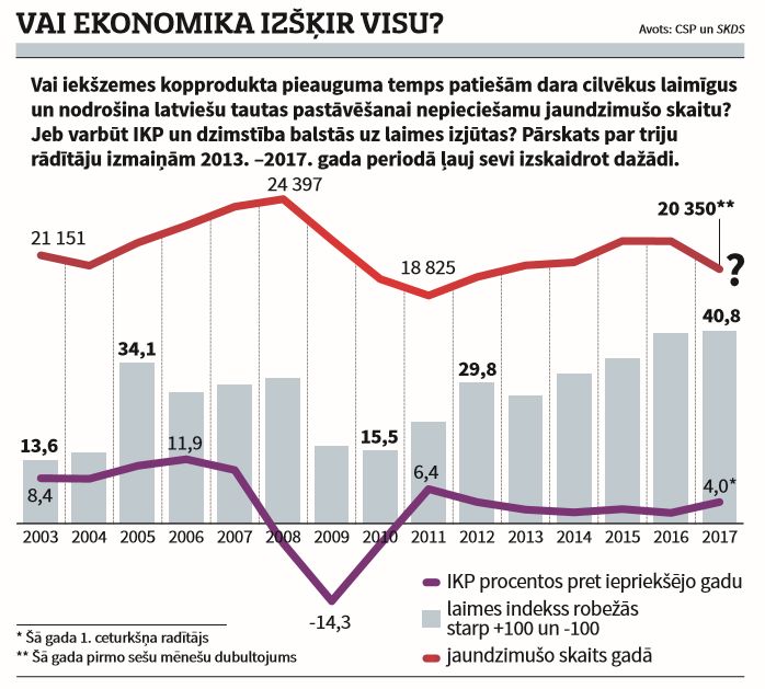 Nav lielu domstarpību starp ikdienas viedokļiem un akadēmisko zinātni par to, ka pamatu pamats gan laimes, gan dzimstības rādītājiem būtu meklējams ekonomikā, ko mēdz vienkāršot līdz iekšzemes kopprodukta (IKP) apjomam un izmaiņām. Savietojot visas trīs - dzimstības, laimes indeksa un IKP izmaiņu - līknes pārskatā par 2003.-2017. gada periodu, kaut kāda tīri grafiska līdzība starp līkņu kāpumu un kritumu posmiem parādās.