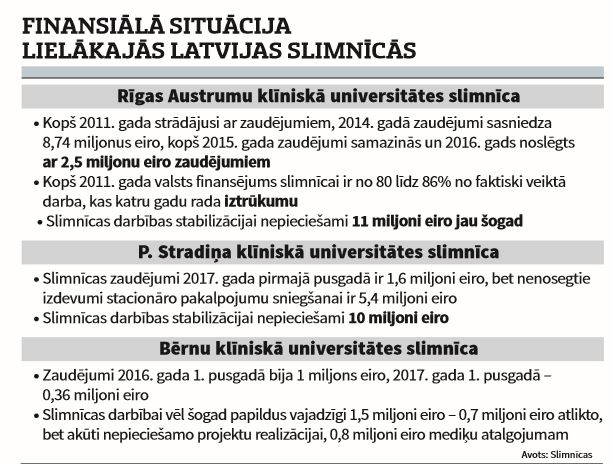 Vissliktākajā situācijā ir Rīgas Austrumu slimnīca, kuras zaudējumi pērn bija 2,5 miljoni eiro. Slimnīcu vadītāji ir vienoti viedoklī, ka universitātes slimnīcas sniedz medicīnisko palīdzību vissarežgītākajiem pacientiem, taču tajā pašā laikā saņem neadekvāti zemu finansējumu. Piemēram, Rīgas Austrumu slimnīcas mediķu vidējais atalgojums ir zemāks nekā citās Latvijas slimnīcās.