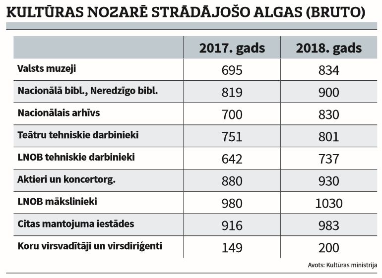 «Kamēr valstī vidējā darba samaksa aug strauji, tikmēr kultūras jomā tā nereti atpaliek no vidējās,» Saeimas Izglītības, kultūras un zinātnes komisijā teica kultūras ministre Dace Melbārde. Piemēram, muzeju darbiniekiem līdz šim darba samaksa bijusi 635 eiro (bruto), bet nacionālajā arhīvā - 700 eiro.